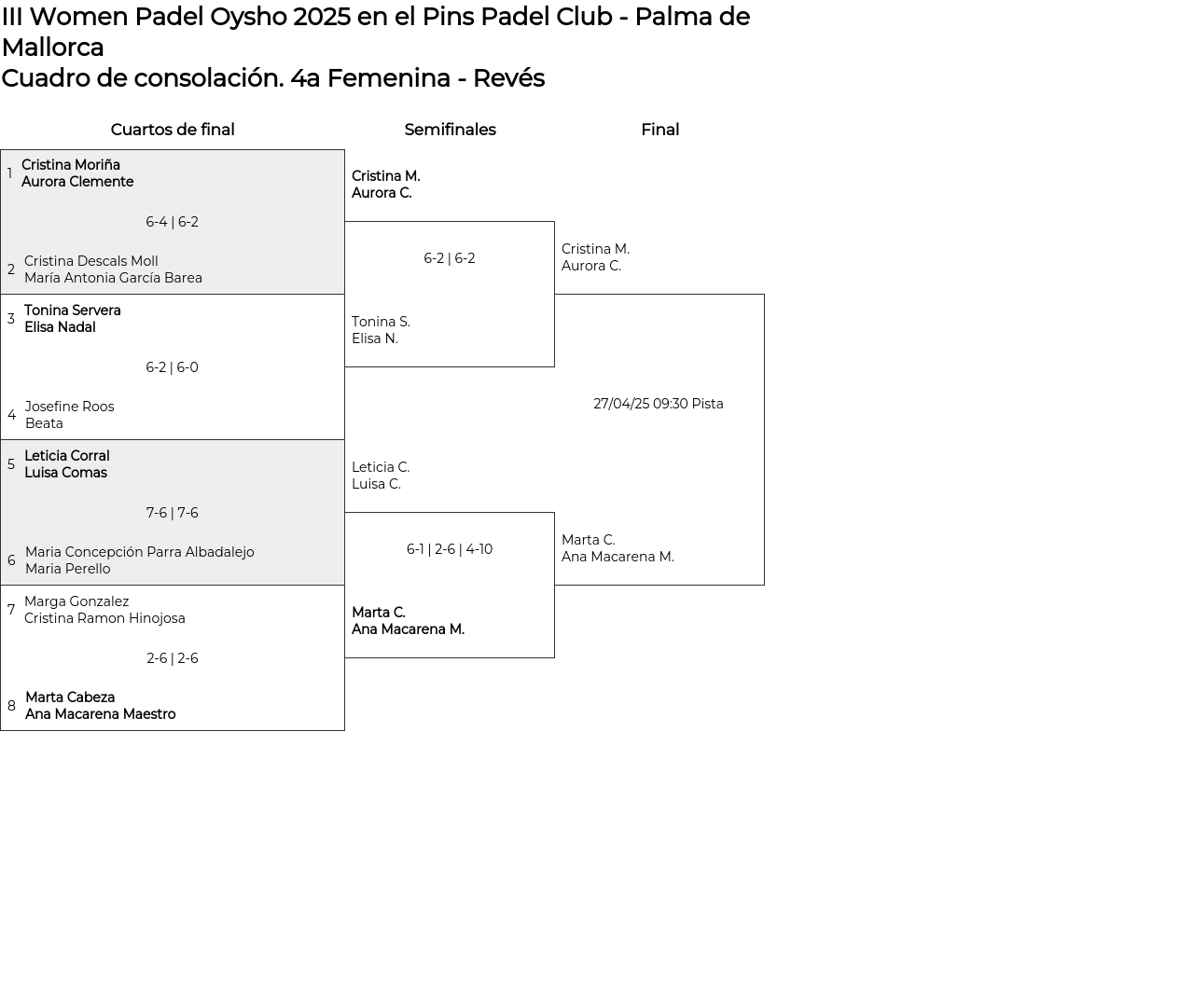 Cuadro de consolación 4a Femenina - Revés